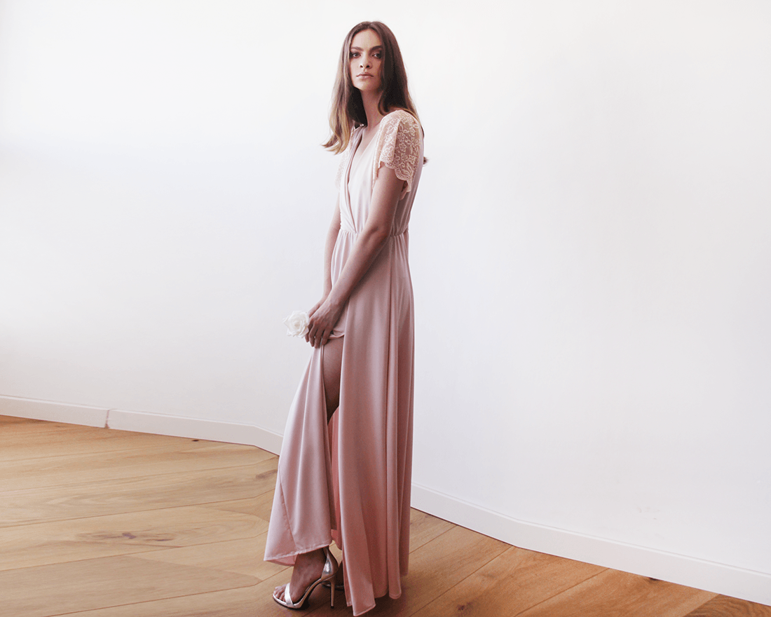 Sheer cap sleeves offer a bit of coverage, while the high front slit and deep V-back further the style’s romantic allure.
