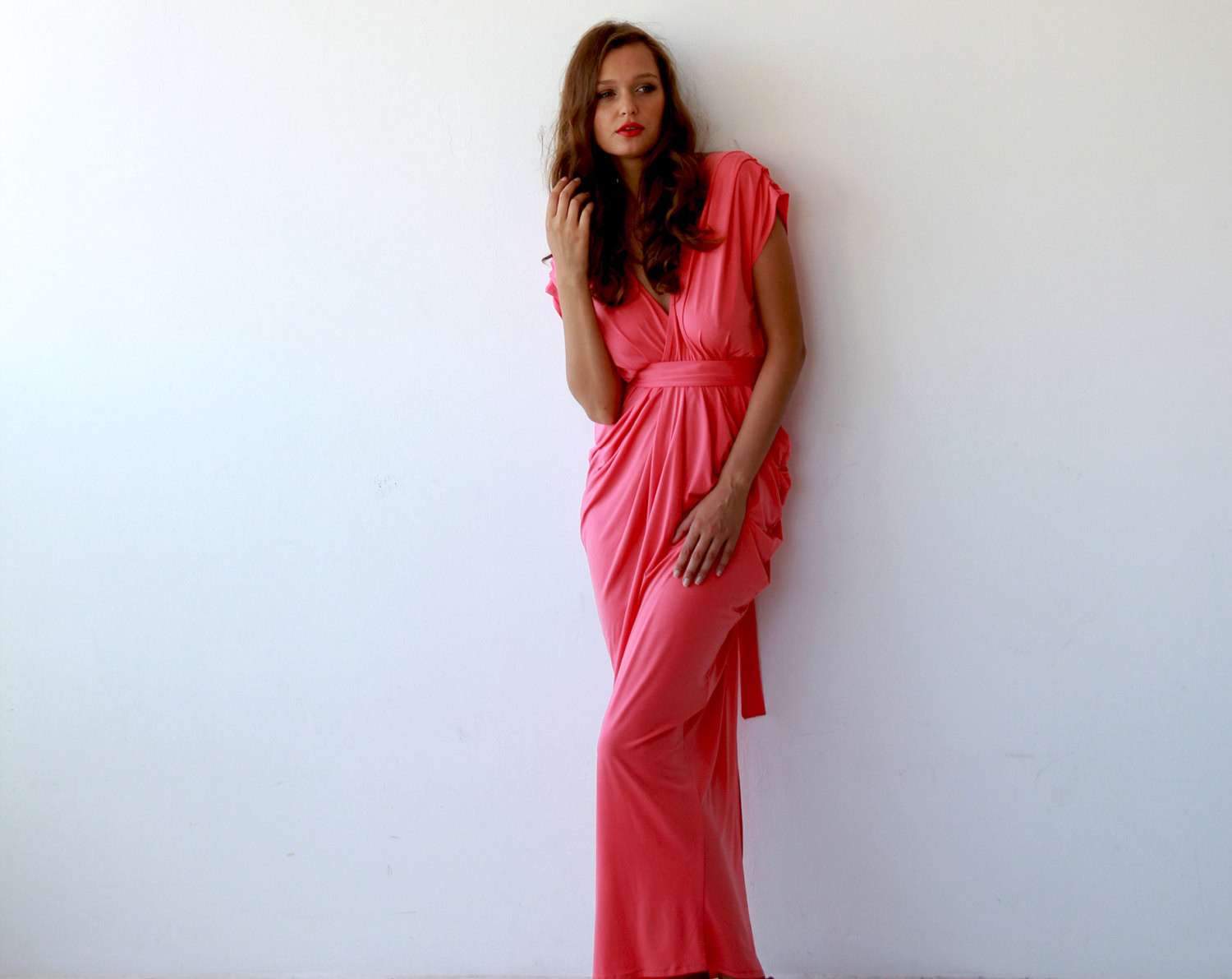 Maxi coral dress. Great choice as a wedding guest dress. Magnificent party dress, with a feminine modern cut. Made from a lovely viscose knit blend with a silky look. Great for any evening occasion: wedding, premier, party, and prom.